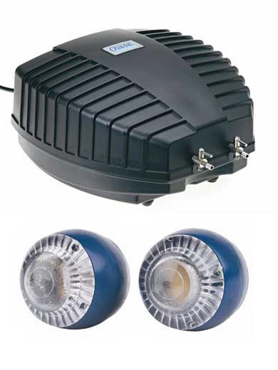 Rückschlagventile ermöglichen den Betrieb unterhalb des Wasserniveaus. Die Luftfördermenge von 1.000 Litern pro Stunde strömt über zwei Ausströmersteine, die jeweils über einen 5-m-Schlauch mit der Pumpe verbunden sind, aus. Die Luftmenge versorgt kleinere bis mittelgroße Gartenteiche bis 10 cbm Wasserinhalt ausreichend mit Sauerstoff.