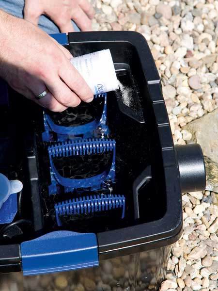 Der innovative pumpengetätigte Schlammaustrag aus dem Filtersystem wird von Experten als besonders effektive Maßnahme gegen das Wachstum von Fadenalgen hoch bewertet. Im Schlamm sammeln sich Phosphate als Nahrungsbausteine für Fadenalgen an. Optimal beim neuen OASE FiltoMatic CWS ist ebenfalls die automatische Intervallreinigung, mit der kontinuierlich dem Teichwasser Verunreinigungen und unter Mitwirkung des UVC-Vorklärgeräts Schwebealgen entzogen werden. Sowohl der Schlammaustrag als auch die Intervallreinigung sind automatisch und individuell steuerbar.