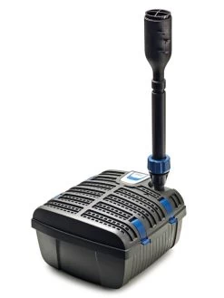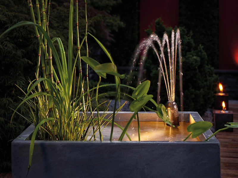 Durch einen regulierbaren zweiten Pumpenabgang (1/2″) ist der gleichzeitige Betrieb einer Fontäne und eines weiteren Wasserspiels möglich. Optional ist ein Blüfterset als Zubehör erhältlich.