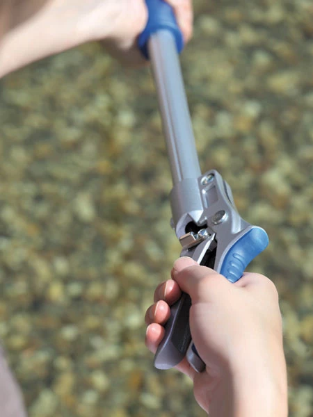- 2 in 1 Teichschere, die beim Schneiden das Schnittgut gleichzeitig festhält.