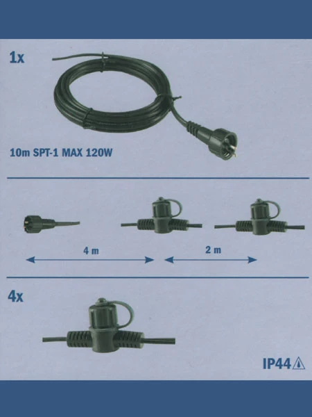 Das 10 m lange Kabel SPT-1 verbindet bis zu 4 Leuchten mit dem dafür vorgesehenen Trafo (geeignet für 21 W und 60 W Transformatoren).