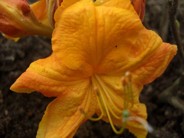 Blüte: Besonders große, weit geöffnete, sonnengelbe Blüten zieren den Rhododendron luteum ‚Klondyke‘. Ergänzt wird die gelbe Grundfarbe der Blüte durch eine markante orange-gelbe Maserung, die an eine Flamme erinnert. Gerne wird die Blüte daher als orange geflammt beschrieben. Ein Blütenstand setzt sich aus mehreren, duftenden Einzelblüten zusammen. Pro Blütenstand sind es zwischen 8 und 15 Einzelblüten. Die dunkelgrünen Laubblätter bilden einen hervorragenden Kontrast zur Blütenfarbe. Sie sind elliptisch geformt und zwischen 9 und 4 cm lang. Besonders schön sind sie im Herbst, während ihrer Herbstfärbung anzusehen.