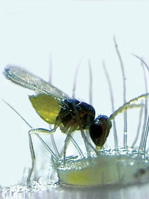 Diese Schlupfwespe (Encarsia formosa) ist die natürliche Gegenspielerin der weißen Fliege. Sie legt jeweils ein Ei in die Larve der weißen Fliege, die sich nach ca. 10 Tagen schwarz verfärbt.
