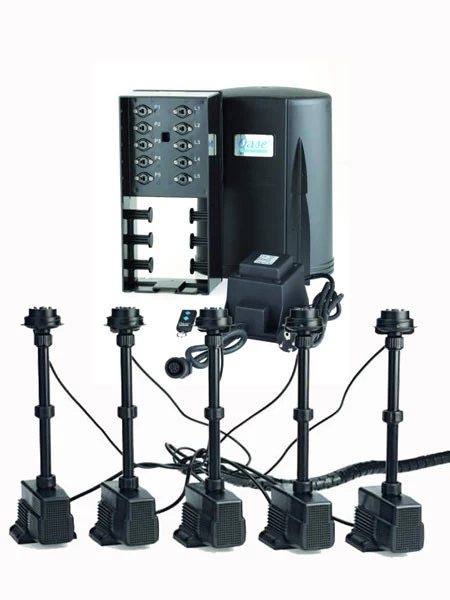 Die Variante mit fünf einzelnen Pumpen ist frei konfigurierbar. Somit sind Ihrer Kreativität fast keine Grenzen gesetzt. Es verfügt über 5 individuell angesteuerte Düsen, deren Fontänenhöhe und Geschwindigkeit durch fest eingestellte Programme per mitgelieferter Fernbedienung (max. 80 m Reichweite) wählbar sind.