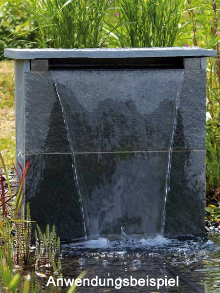 In Kombination mit der richtigen Teichpumpe entsteht ein breiter Wasserfilm, der fast lautlos zurück in den Gartenteich oder ein Auffangbecken gleitet.