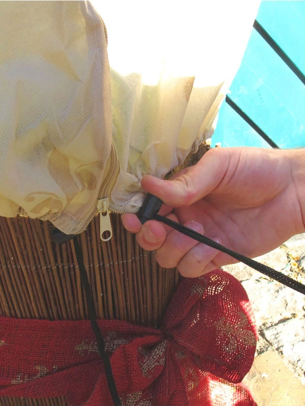Die XXL Vlieshaube kann sehr einfach und schonend auch um große Pflanzen gelegt werden. Der seitlich verlaufende Reißverschluss kann dazu über die gesamte Höhe geöffnet werden. Die Haube wird über die Pflanze gelegt, dann der Reißverschluss geschlossen. Zum Schluss die Zugkordel am unteren Rand so stark raffen, dass ein enger Anschluß an Kübel oder Stamm hergestellt wird. Oben ist die Haube geschlossen.